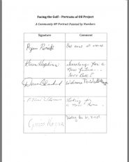 Portraits created by Gulf Coast residents affected by BP's Deepwater oil spill, submitted to the BP Portrait Award run by The National Portrait Gallery (NPG); http://facingthegulfportraitsofoil.blogspot.com